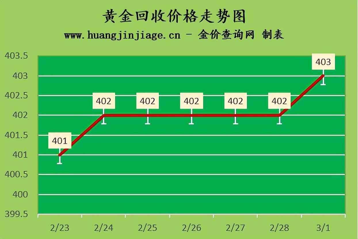 黄金回收价格403元/克,铂金回收价格187元/克,钯金回收价格298元/克,18K金回收价格290元/克,银条回收价格3.6元/克。(黄金行情是波动的,回收金价没有固定标准。)