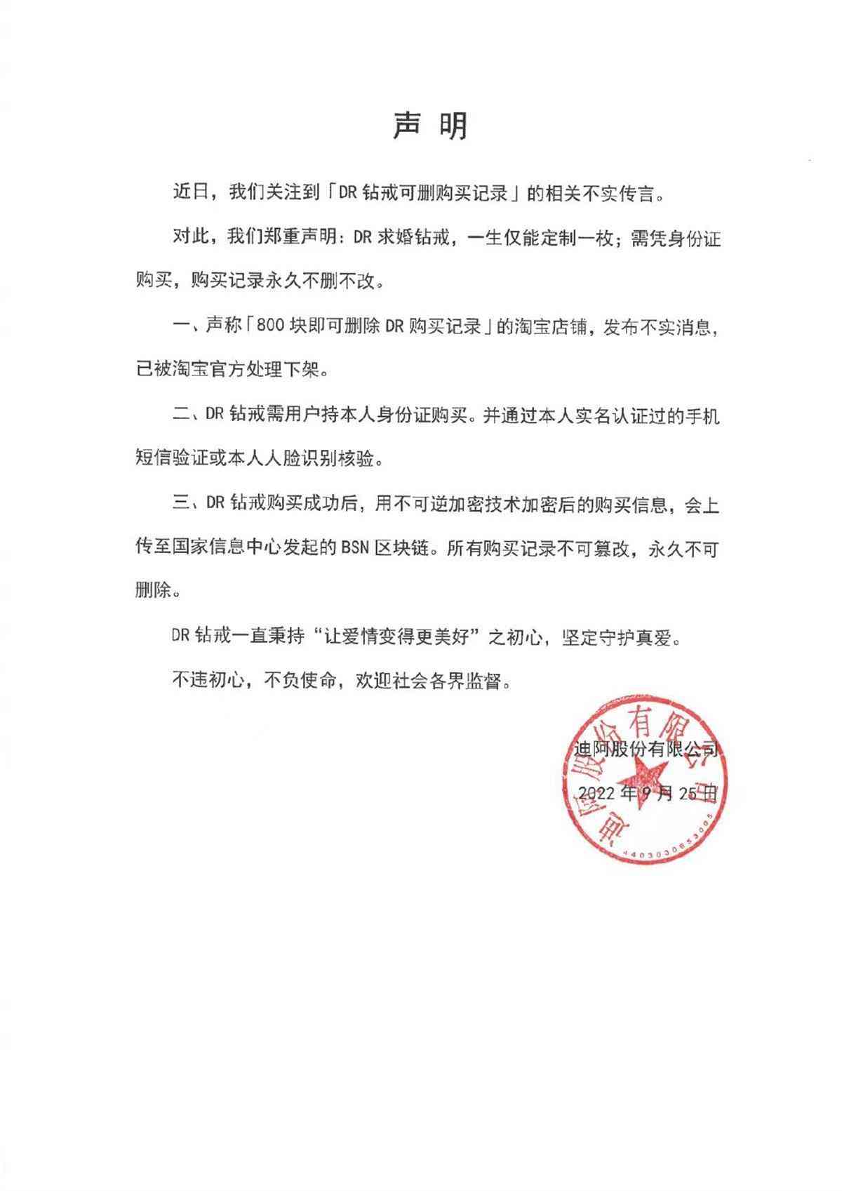 针对“购买记录可以删除”传言,迪阿股份在声明中表示,在用户购买DR钻戒后,购买记录运用了不可逆技术加密,同时会上传至国家信息中心发起的BSN区块链。所有购买记录不可篡改,永久不可删除。