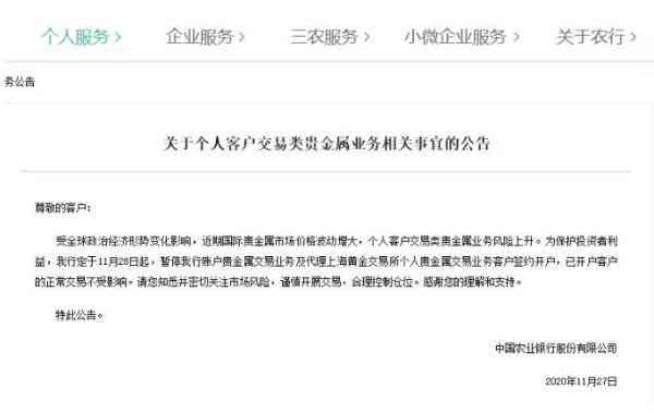 农业银行称,受全球政治经济形势变化影响,近期国际贵金属市场价格波动增大,个人客户交易类贵金属业务风险上升。为保护投资者利益,我行定于11月28日起,暂停我行账户贵金属交易业务及代理上海黄金交易所个人贵金属交易业务客户签约开户,已开户客户的正常交易不受影响。请您知悉并密切关注市场风险,谨慎开展交易,合理控制仓位。感谢您的理解和支持。