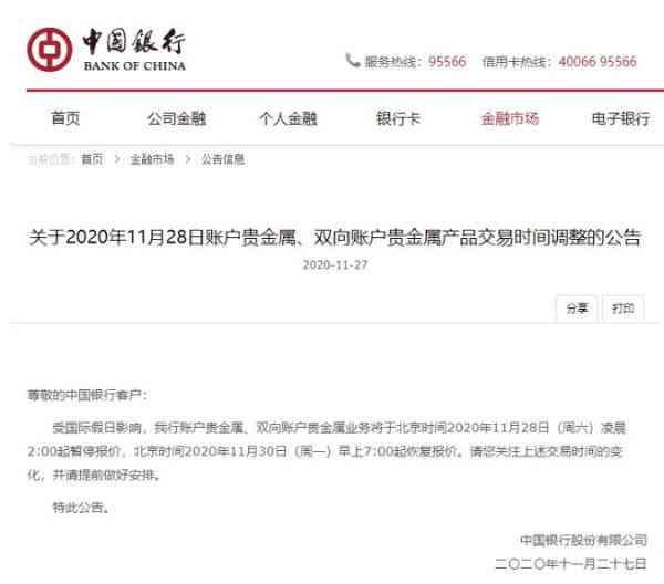 中国银行称,受国际假日影响,我行账户贵金属、双向账户贵金属业务将于北京时间2020年11月28日(周六)凌晨2:00起暂停报价,北京时间2020年11月30日(周一)早上7:00起恢复报价。请您关注上述交易时间的变化,并请提前做好安排。