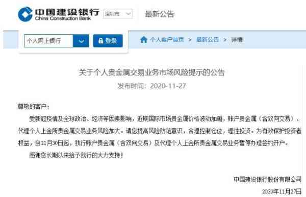 建设银行称,受新冠疫情及全球政治、经济等因素影响,近期国际市场贵金属价格波动加剧,账户贵金属(含双向交易)、代理个人上金所贵金属交易业务风险加大。请您提高风险防范意识,合理控制仓位,理性投资。为有效保护投资者权益,自11月30日起,我行账户贵金属(含双向交易)及代理个人上金所贵金属交易业务暂停办理签约开户。