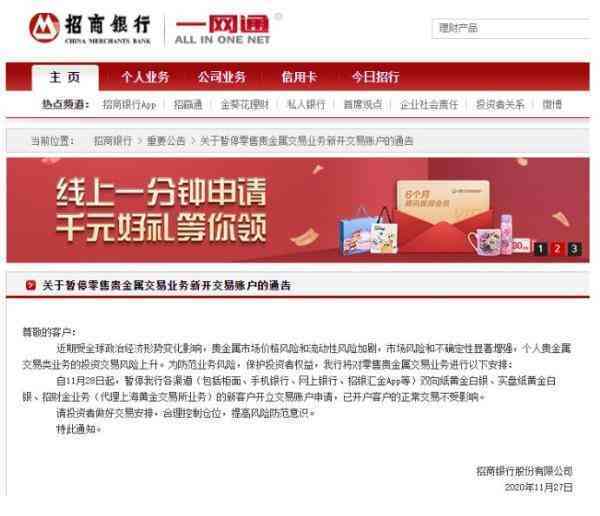 自11月28日起,暂停我行各渠道(包括柜面、手机银行、网上银行、招银汇金App等)双向纸黄金白银、实盘纸黄金白银、招财金业务(代理上海黄金交易所业务)的新客户开立交易账户申请,已开户客户的正常交易不受影响。