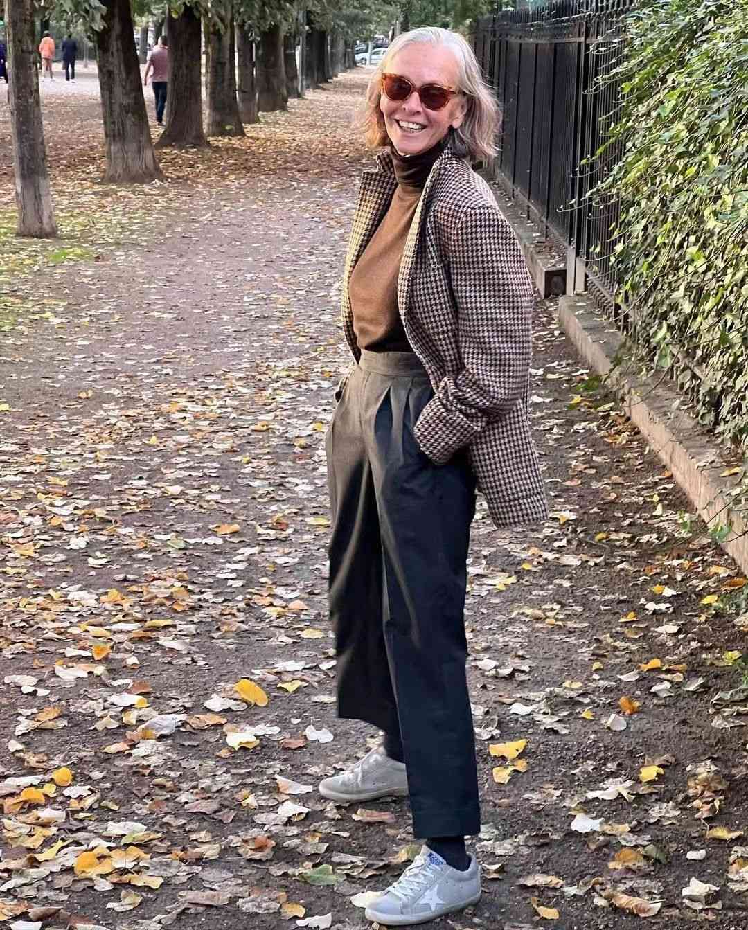 还有一种搭配方式,也是值得借鉴的,大地色西装配大地色烟管裤,内大粉色衬衣,这样一身在一头发白的衬托下显得更加大气优雅。