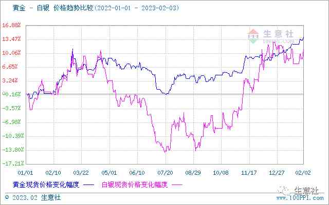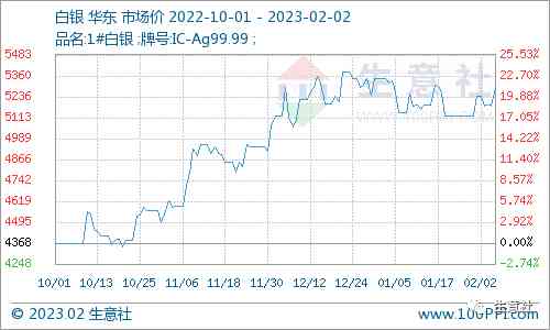据生意社监测,2023年2月2日白银市场均价5293.67元/千克,日涨2.13%。较1月1日现货市场早盘均价5345元/千克,下跌0.96%;较2022年10月1日现货市场早盘均价4368.33元/千克,上涨21.18%。近1年贵金属黄金白银价格趋势对比