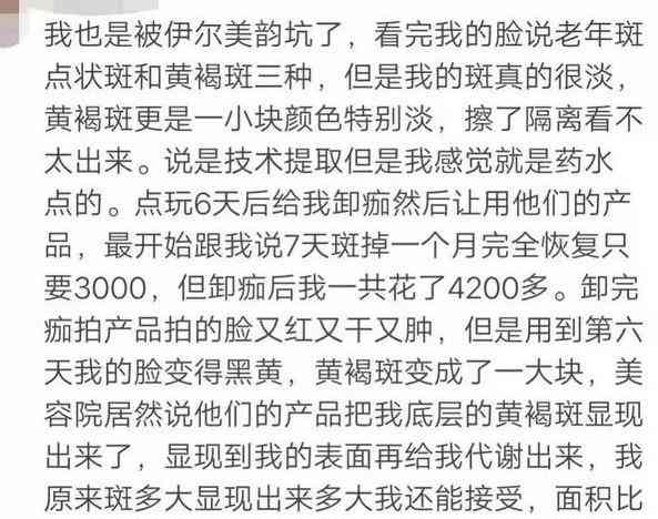 小周(化名)就是一位伊尔美韵的受害人,对于她的遭遇,她如此说道:“我也是被伊尔美韵坑了,他们看完我的脸说是用技术提取,但是我感觉就是药水点的,点完6天后让我用他们的产品,最开始跟我说7天斑掉,一个月完全恢复,只要3000,但之后我一共花了4200多。并且产品用到第六天脸就变得黑黄,黄褐斑的面积比以前大了一倍,最后停用去了医院。”(内容有删改)