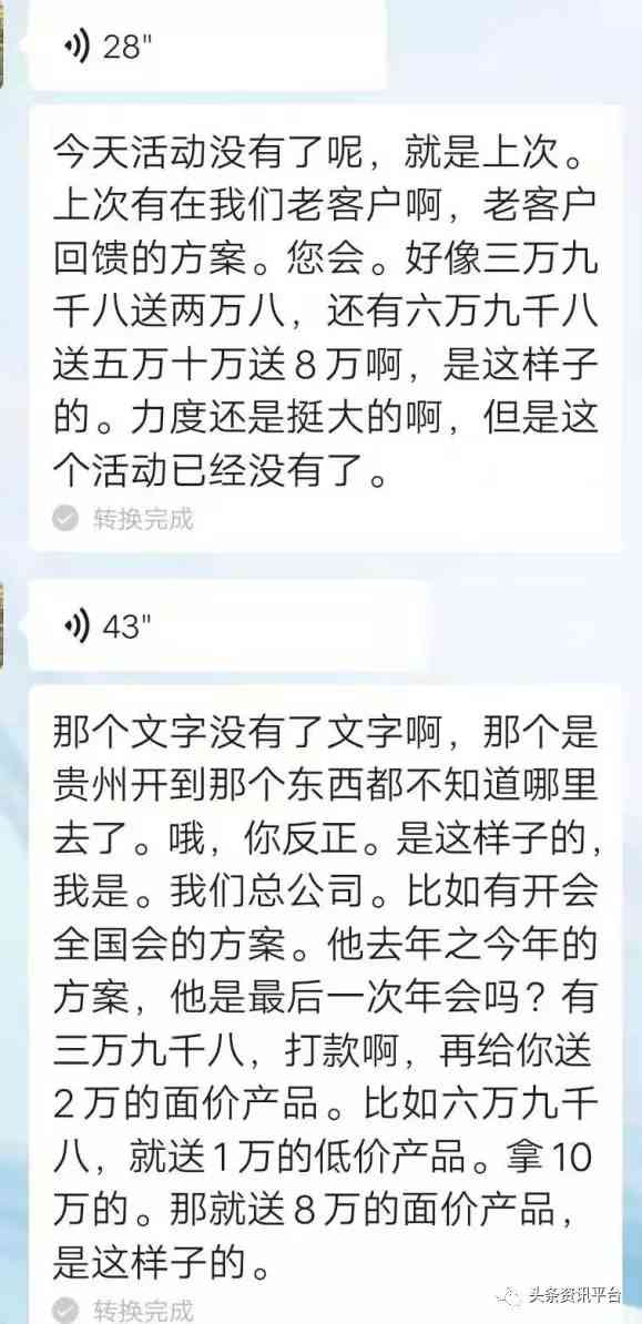 虽然这个制度单一,但是叶先生表示,每年的活动和福利都不相同:“比如去年到今年的活动是只要你打款三万九千八就送价值两万的产品,六万九千八就送价值五万的产品,消费十万就送价值八万的产品。但因为前段时间集团开了年会,在年会上取消了其他的方案,只留下了16800这个最低门槛。”