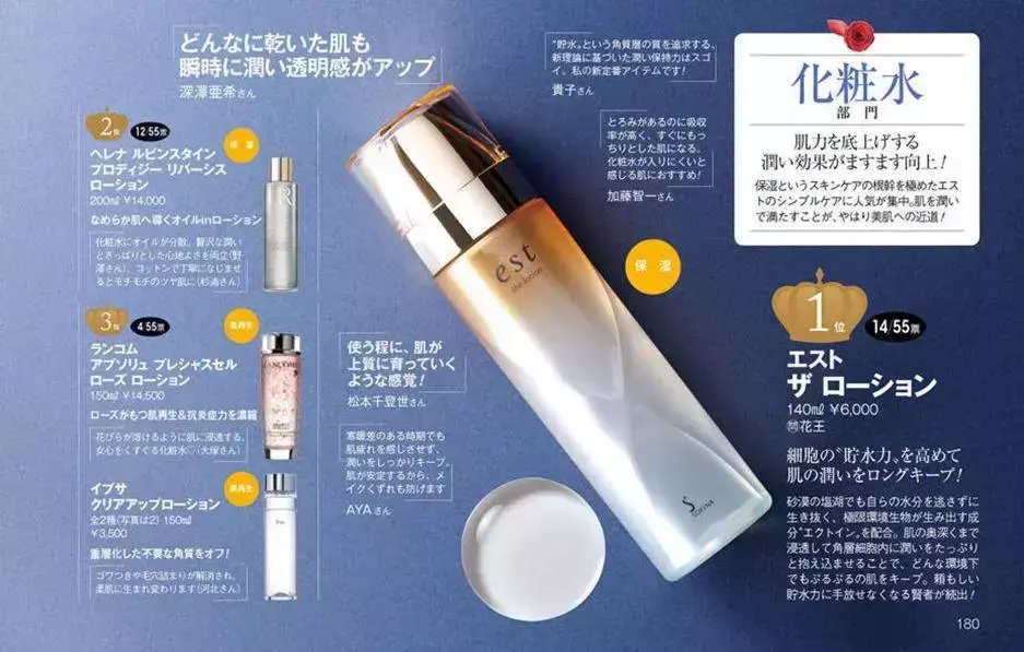 最佳化妆水来自花王旗下高端奢侈护肤品牌EST的the lotion化妆水。140ml,约353元人民币。