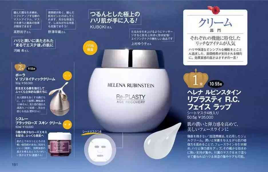 最佳面霜一位是赫莲娜Re-PLASTY面霜,俗称白绷带面霜。主打美白修复和紧致。约2061元50g,也是真贵。