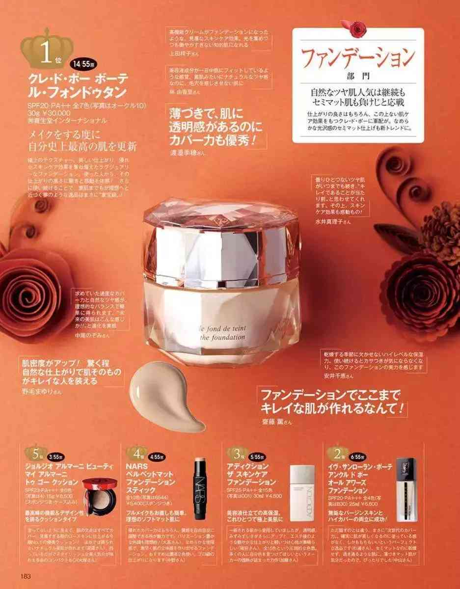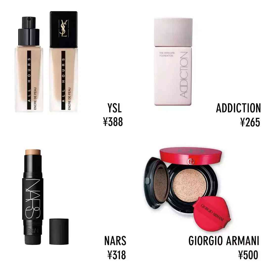 2-5位分别是YSL ALL HOURS粉底液、Addiction的新款养肤粉底液、Nars丝绒迷雾粉底棒和Giorgio Armani的红气垫粉底液。