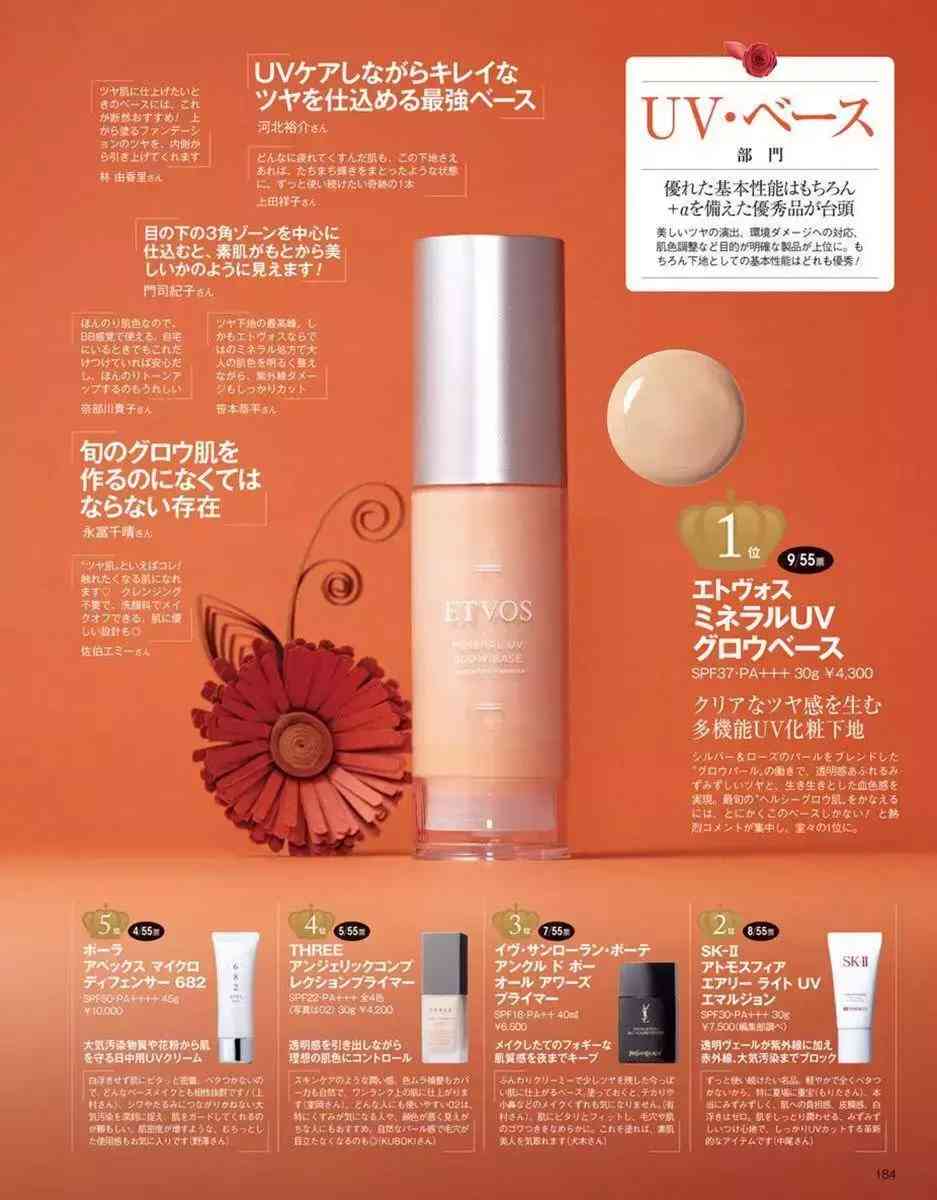 夺得冠军的防晒产品是来自日本的小众护肤品牌Etvos家的矿物防晒打底。价格不贵,30g的含量售价约253人民币。