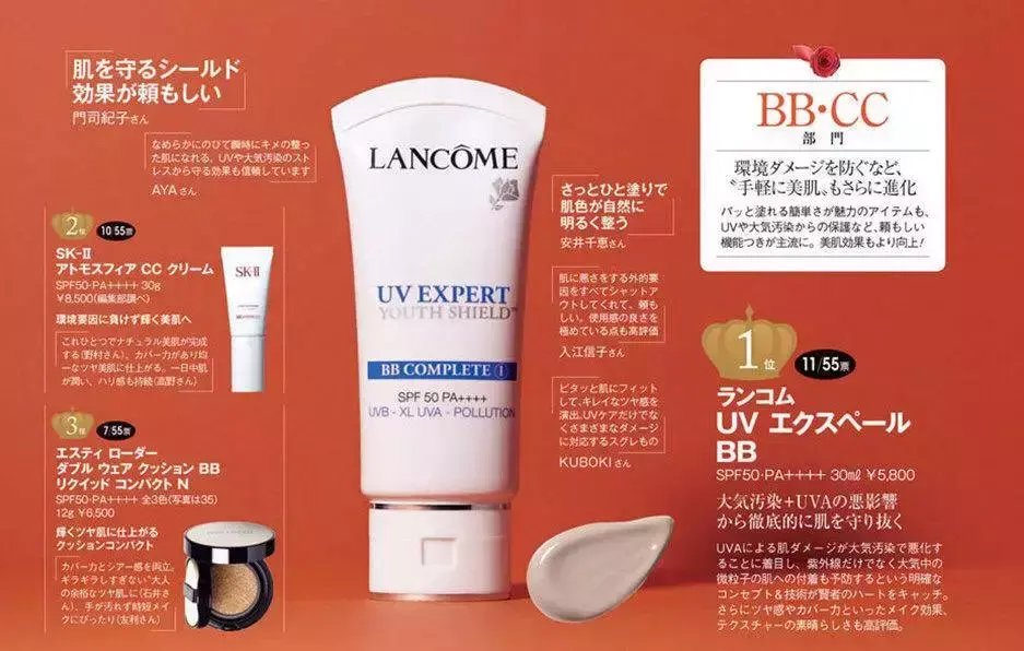 亚军来自SK-II的光感焕白CC霜,季军是雅诗兰黛double wear持久气垫BB。