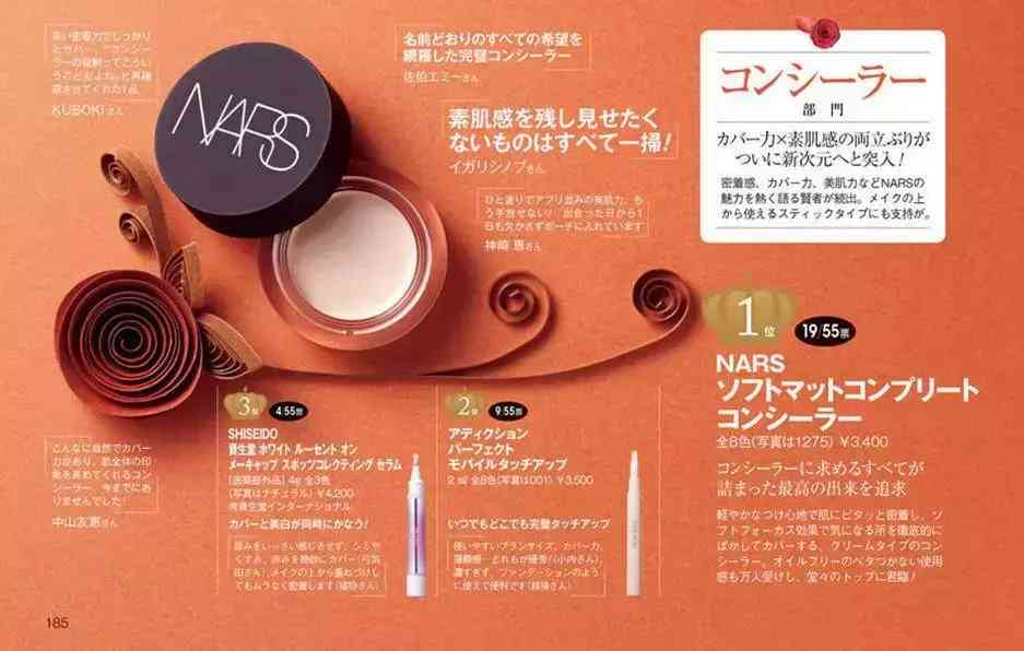 遮瑕冠军是在综合榜单也有着出色成绩的Nars亚光遮瑕,售价3400日元,大概200块人民币。