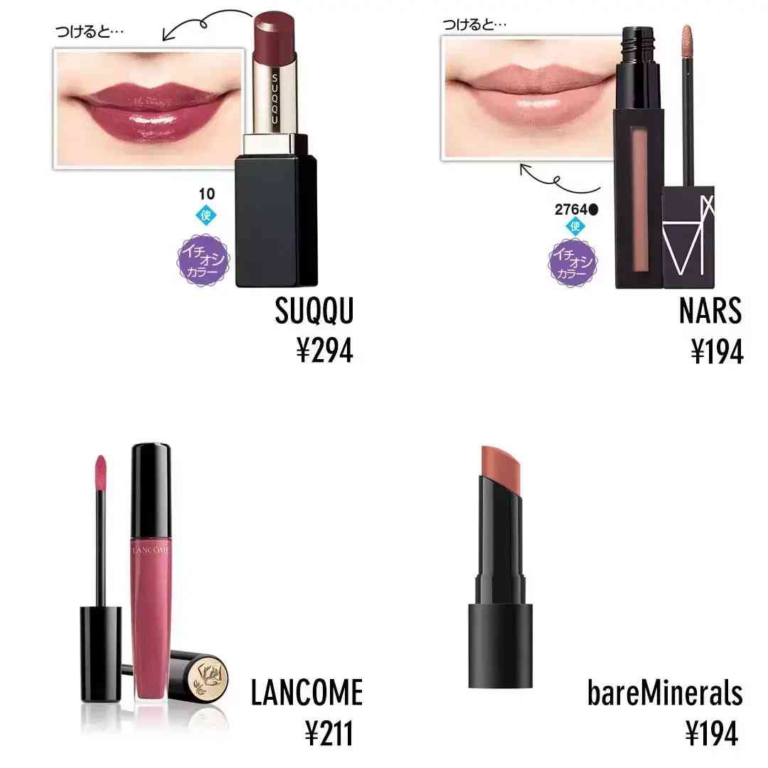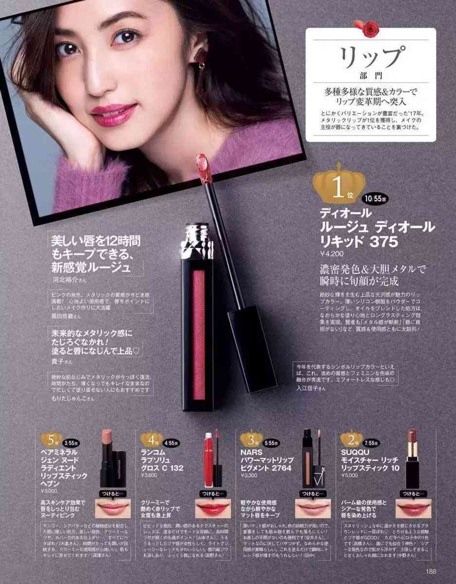 二名是SUQQU的新丰盈光泽唇膏10号,三名是Nars唇釉2764,四名是Lancome唇釉132号,第五名是bareMinerals的ヘブン色号。