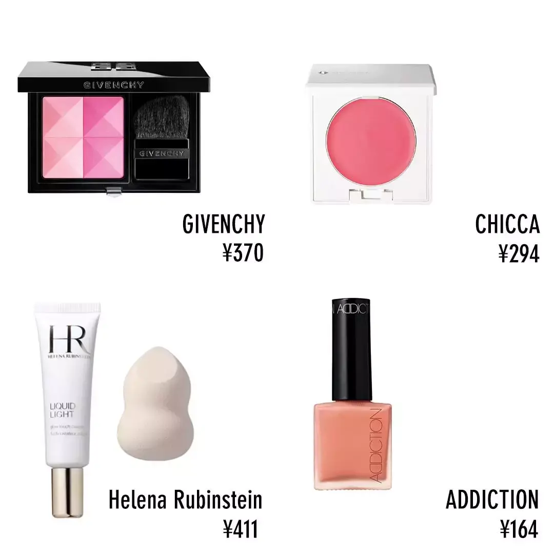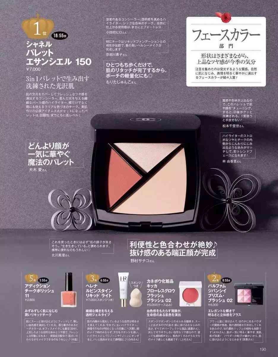 第二名Givenchy4色腮红02号,并列第三分别来自CHICCA的02号色腮红和赫莲娜的提亮液,第五名则被Addiction的液态腮红11号夺得。