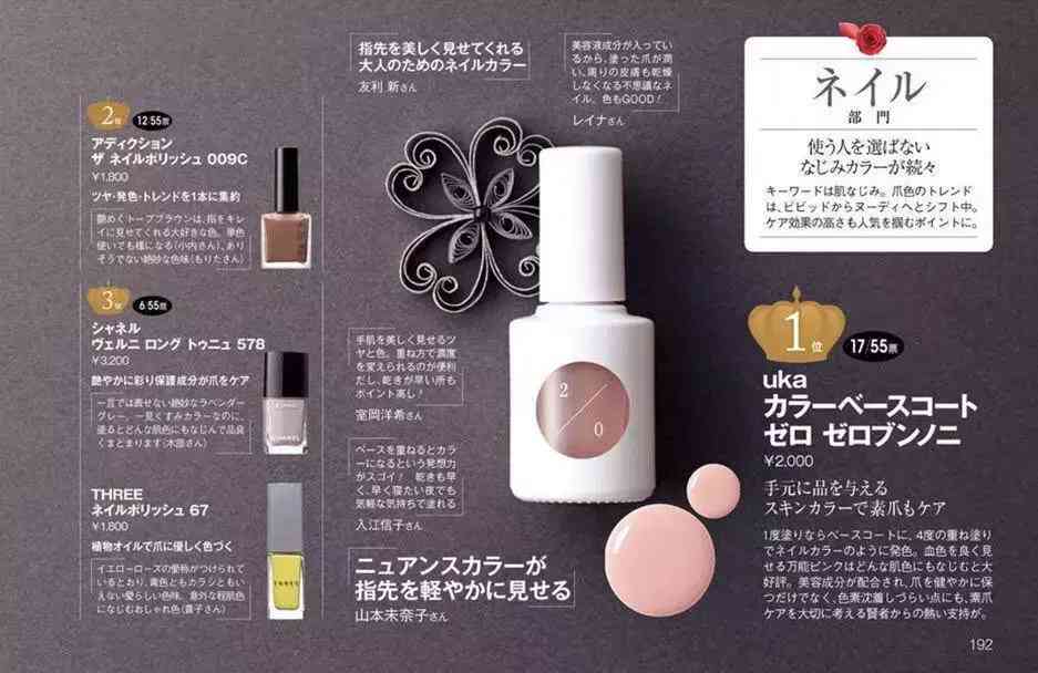 爱自己捯饬指甲的妹子看过来~一年买了不少指甲油吧,不妨一起了解一下日本的甲油票选结果吧!名是uka的甲油2/0。