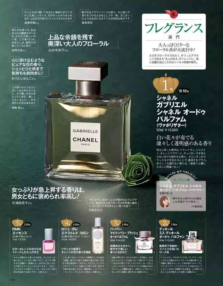 第二名是Dior的Miss Dior Absolutely Blooming,一款花香调的淡香水,很有少女活力的味道。第三名Burberry的My Burberry粉蝴蝶结,很舒服的味道,偏果香。第四是香邂格蕾的白标香水橙花之轻。第五名来自RMK家出的首支香氛RMK ESSENCE淡香水。