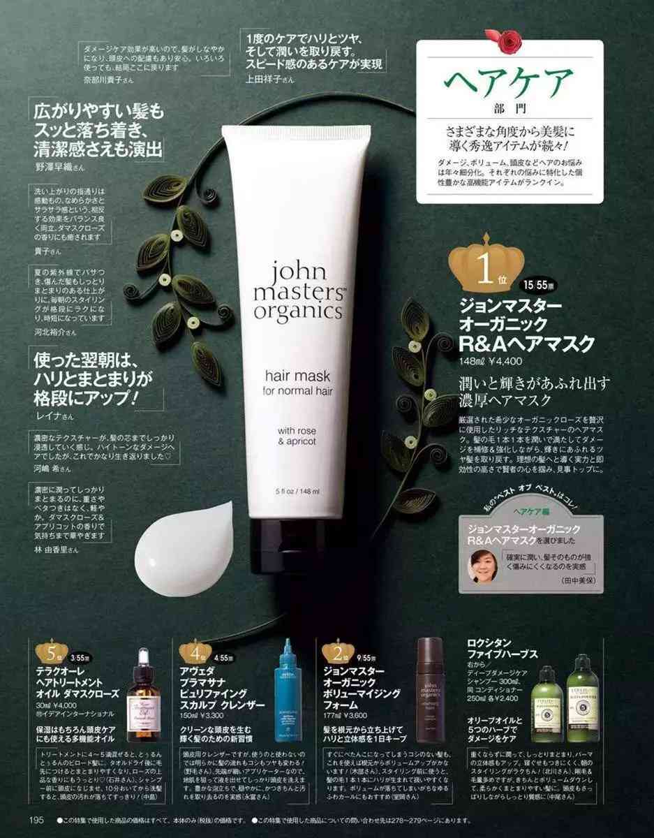 冠军是john masters organics的玫瑰杏桃修护精华护发乳,这个牌子在美国和日本都很受欢迎。