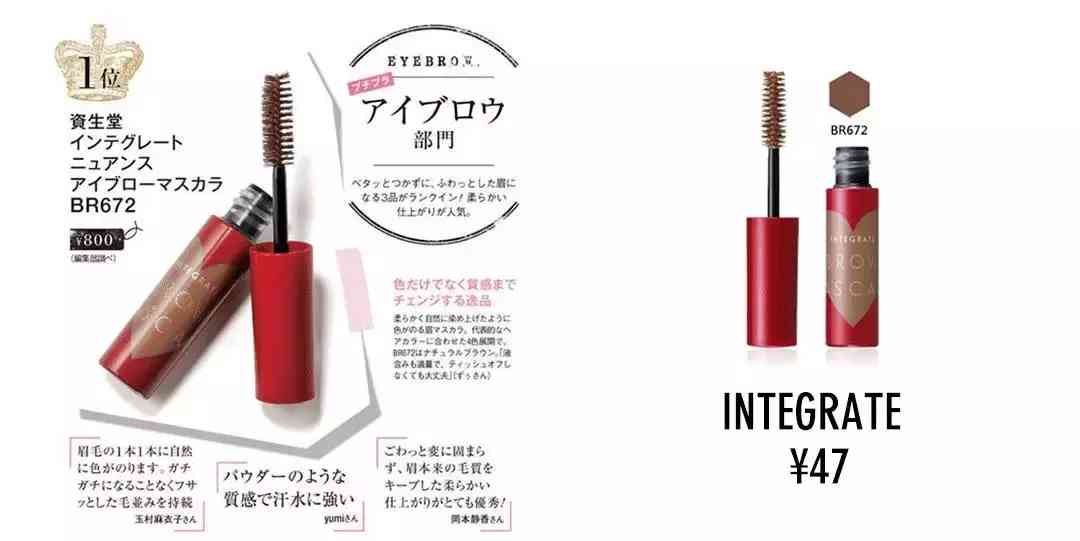 最佳眉笔是资生堂旗下的开架品牌INTEGRATE染眉膏BR672。这只我买过,很好用,颜色也很自然。
