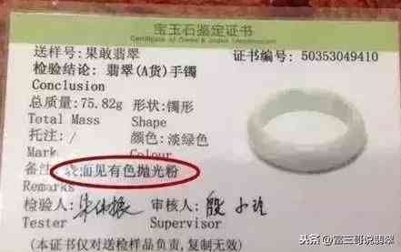 一般来说,抛光粉多的镯子,省检是不能岀证书的。而对于含有微量抛光粉的镯子,省检可以出证书,但证书上会注明“可见抛光粉”字样或“表面见有色抛光粉”等敏感字眼,这样一来,就可以轻松识别自己相中的翡翠是否经过抛光粉致色了。