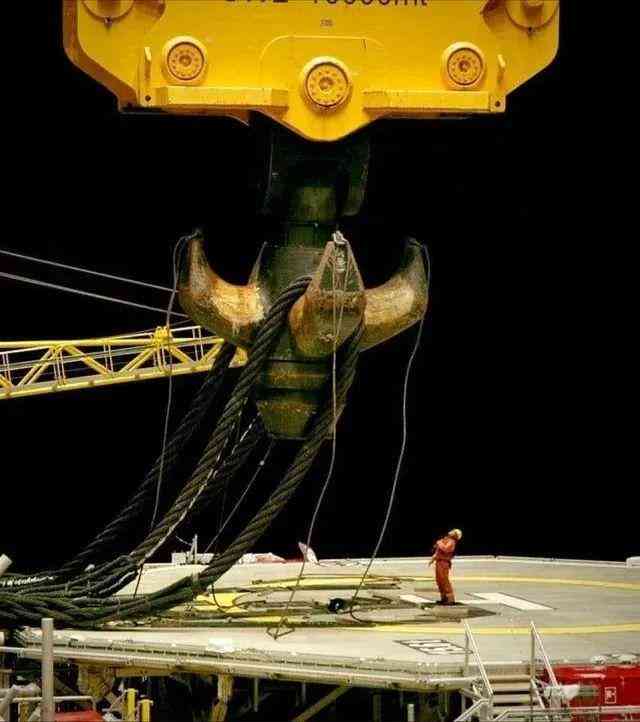 海上钻井平台上,一名工人站在超大型起重机的吊钩下,画风是这样的…