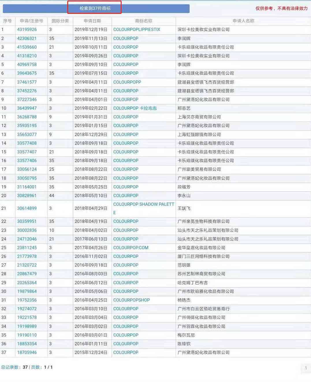 笔者去商标网直接搜索“colourpop”商标,跳出来了37件商标。其中有23件商标都是申请应用在第3类化妆品上的。