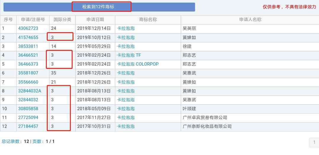 还有人申请“卡乐泡泡”、“卡拉泡泡”等中文商标,这两个申请商标涵盖了多个类别,但其国际分类都含有第3类化妆品。
