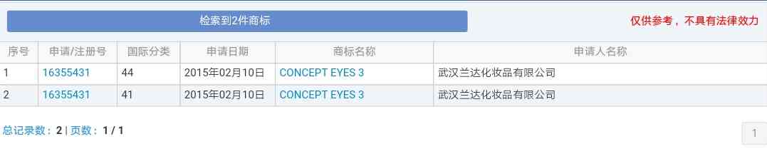 笔者经查询得知,中国3CE所属于武汉兰达化妆品有限公司,该公司共申请了两件商标,商标名称都为“CONCEPT EYES 3”,分别申请在44类、41类。