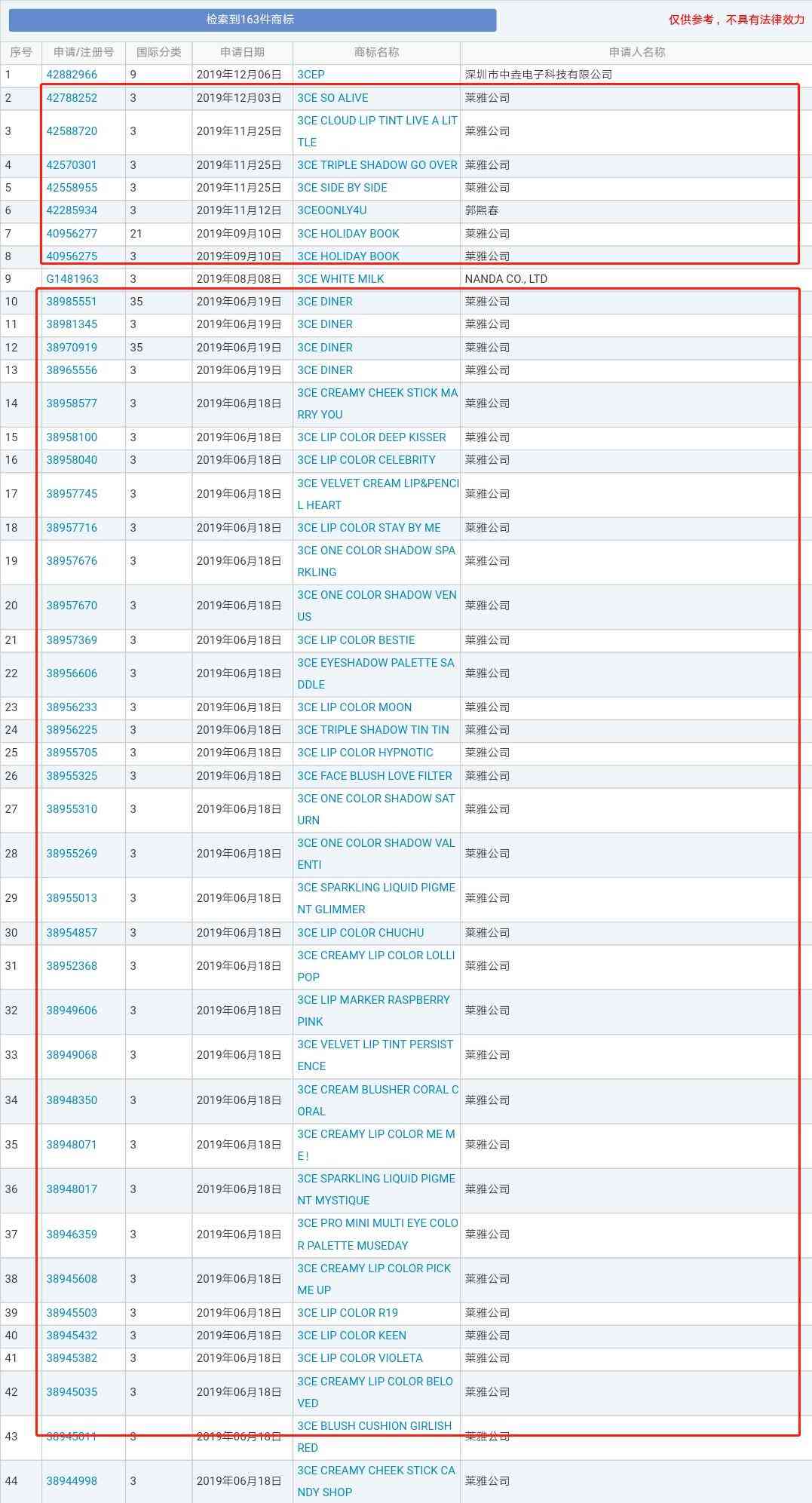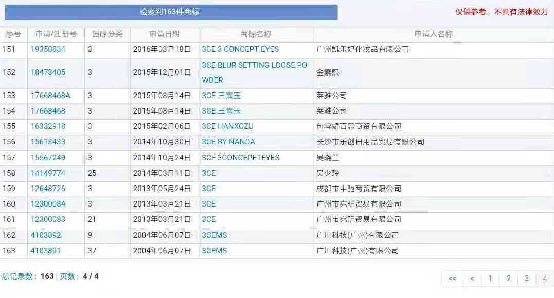 通过商标网查询,共有163件关于“3CE”的商标。