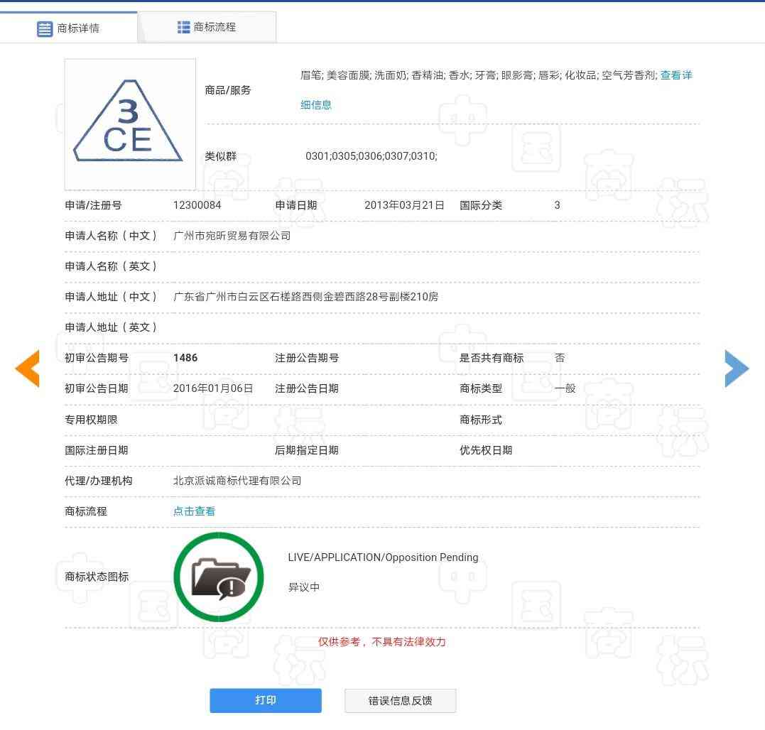 其中,在我国最早申请第3类化妆品“3CE”商标的是一家叫做“广州宛昕贸易有限公司”的企业。该公司申请了多件关于“3CE”字样的商标,其中该公司申请的第12300084号第3类“3CE”商标于2013年3月21日申请,但目前该商标处于异议状态。