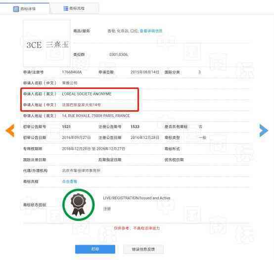 欧莱雅集团申请的件关于“3CE”的商标是第3类17668468A号“3CE 三熹玉”商标,该商标于2015年8月14日申请。