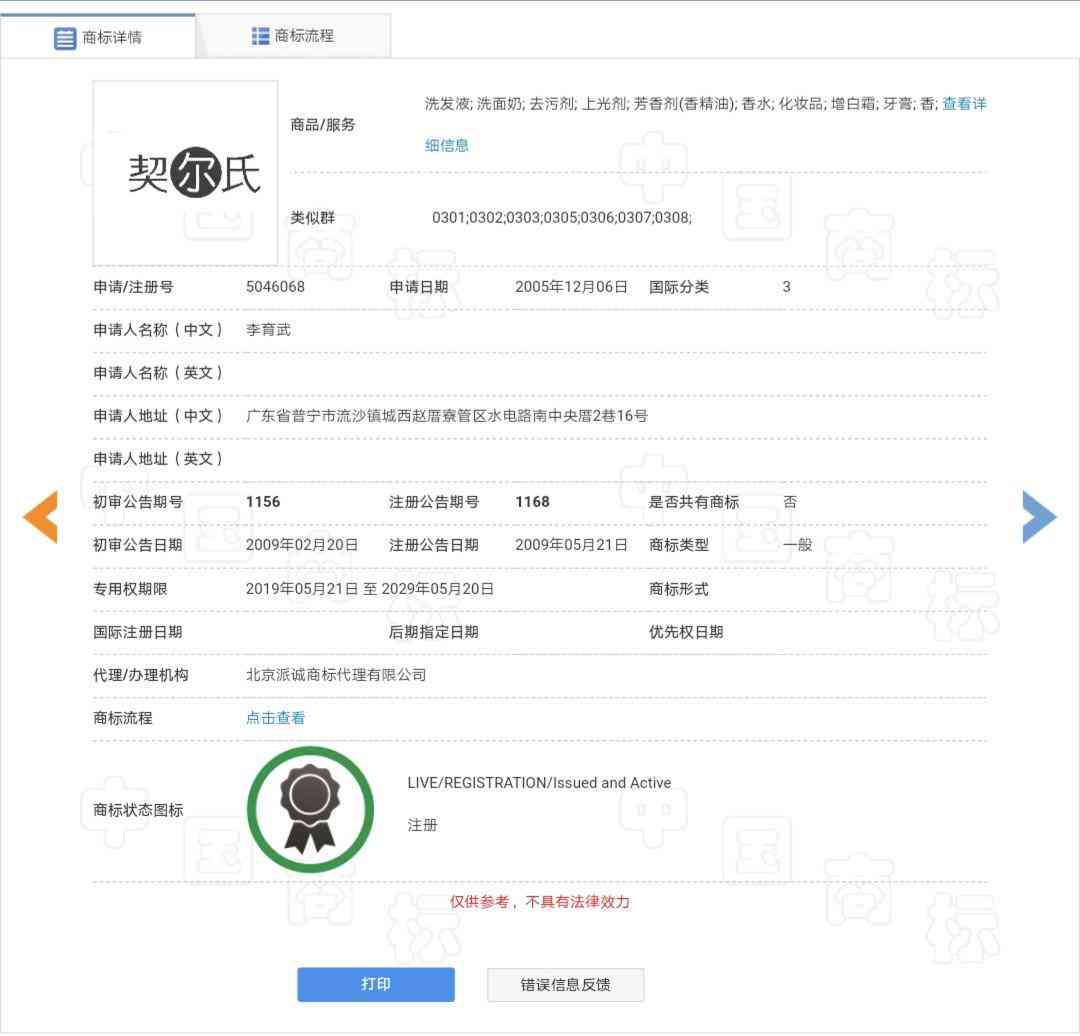 虽然欧莱雅集团被驳回了,但是有一个叫“李育武”的人成功注册了第3类“契尔氏”商标(即第5046068号“契尔氏”商标),并且这位李先生从2005年12月6日至2019年5月31日,已经先后申请了共计10件“契尔氏”的相关商标。