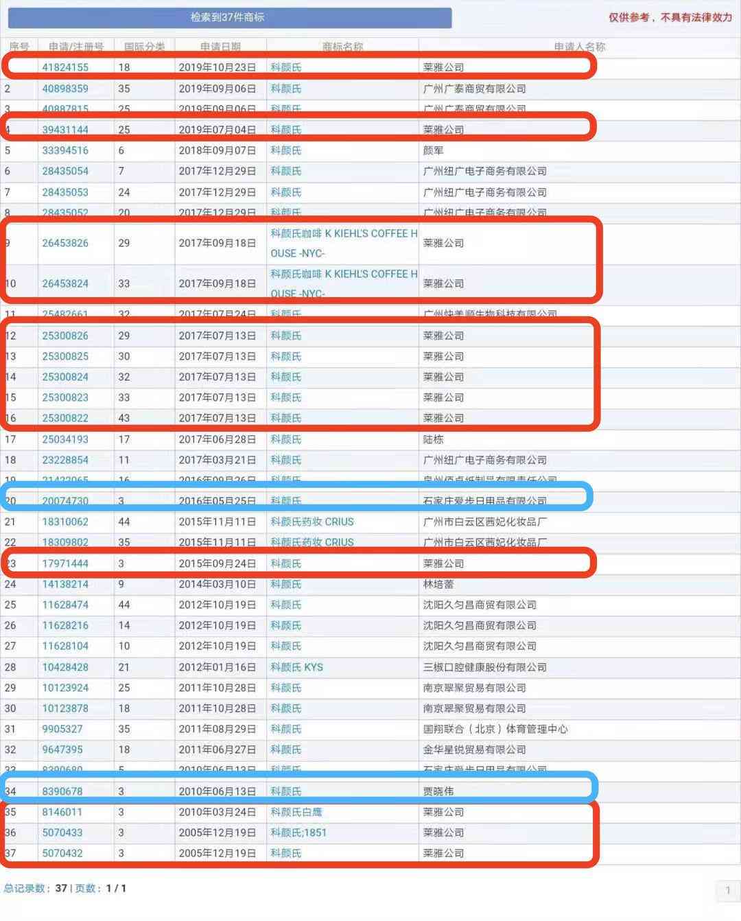 但是即使已经改名了,科颜氏的商标还是没能避免被人蹭热度。经商标网查询,总共有37件与“科颜氏”有关的商标,其中,科颜氏所属的欧莱雅集团申请了13件商标,还有两件第3类的“科颜氏”商标分别是个人和一家公司所申请的。现如今,这两件一件被驳回,一件处于异议状态。