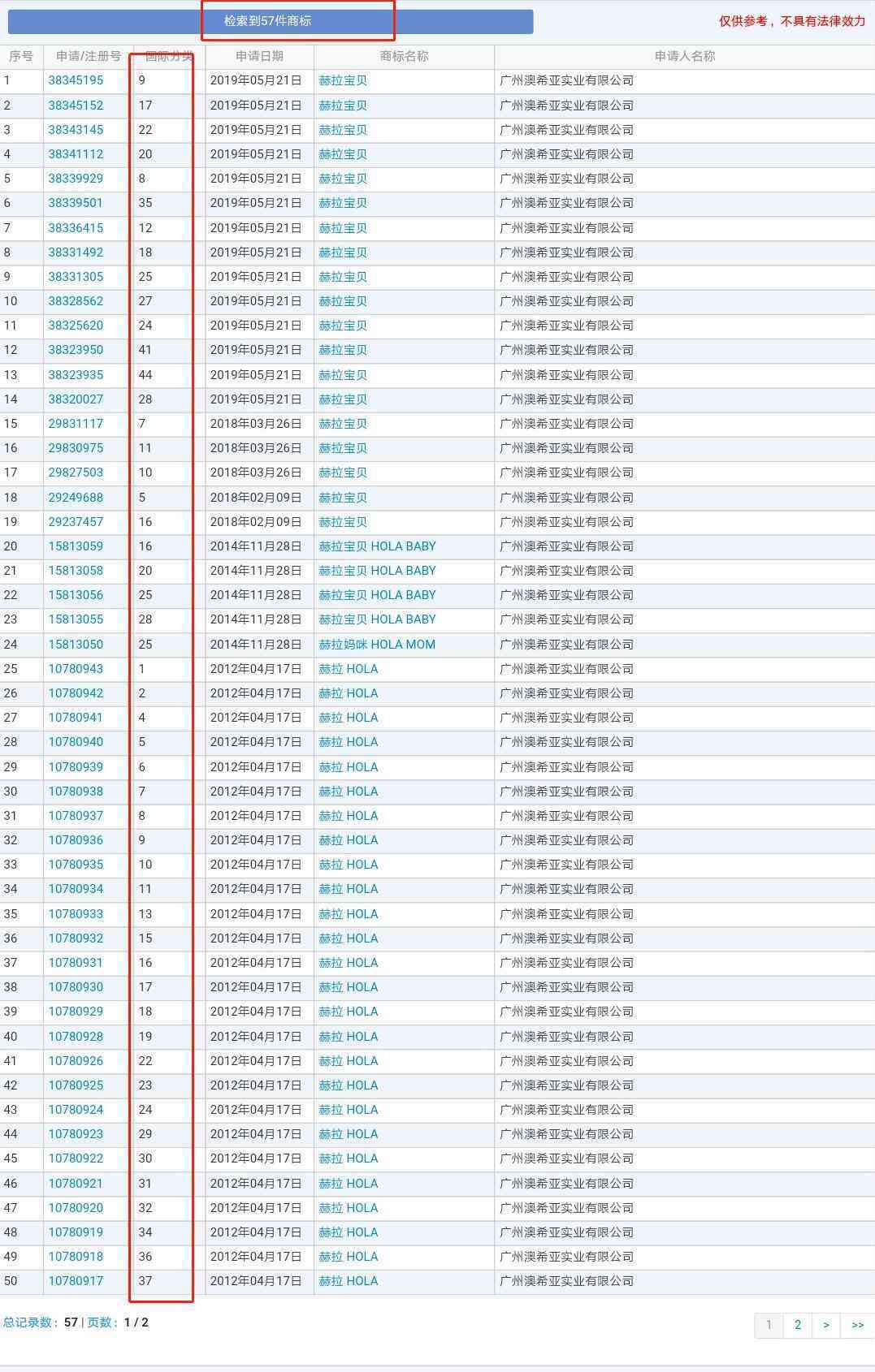 通过查询商标网显示,该公司共申请了57件关于“赫拉”字样的商标,涵盖了多个类别,但是其中并没有一件商标申请服务于第3类化妆品。