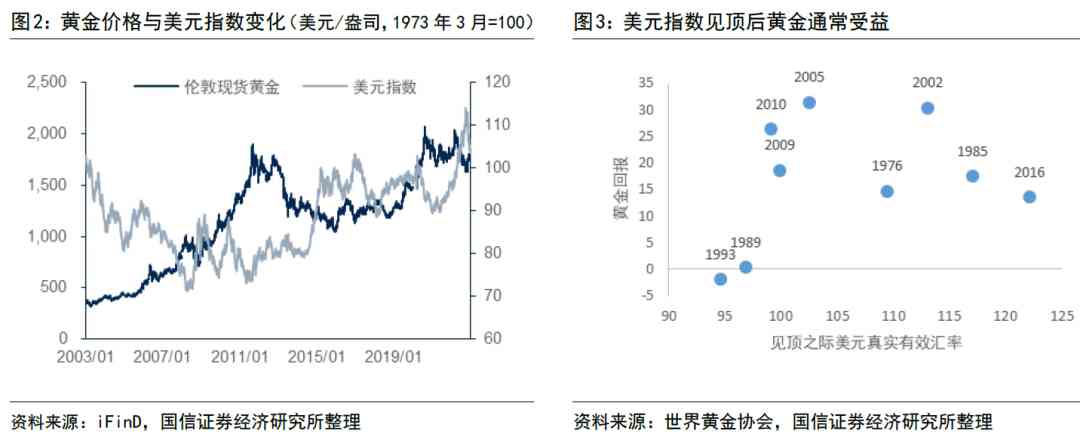 一是美元指数(负相关)。由于黄金存在一定的货币属性,会和与其他货币体现出一定的地位博弈关系,所以黄金价格通常与美元指数负相关,如美元指数上升,美元升值,资金流向美元,黄金价格短期下跌。