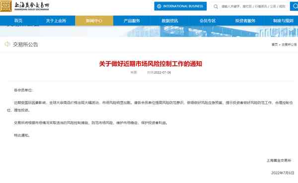 “近期受国际因素影响,全球大宗商品价格出现大幅波动,市场风险明显加剧。”记者注意到,7月6日,上海黄金交易所发布通知,请各会员单位提高风险防范意识,做细做好风险应急预案,提示投资者做好风险防范工作,合理控制仓位,理性投资。