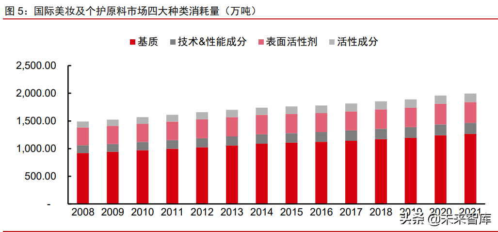 四大类化妆品原料中,从消耗量来看,基质占比最高,活性成分占比最低,比例基本 保持稳定。2021 年国际消耗量上,基质、表面活性剂、技术&性能成分、活性成分的消耗 量分别达到 1265.98 万吨、376.01 万吨、199.87 万吨和 155.15 万吨,占比分别达到 63.4%、 18.8%、10.0%、7.8%。2008-2021 年间四大品类消耗量占比基本保持稳定,体现化妆品 原料配比结构稳定性。