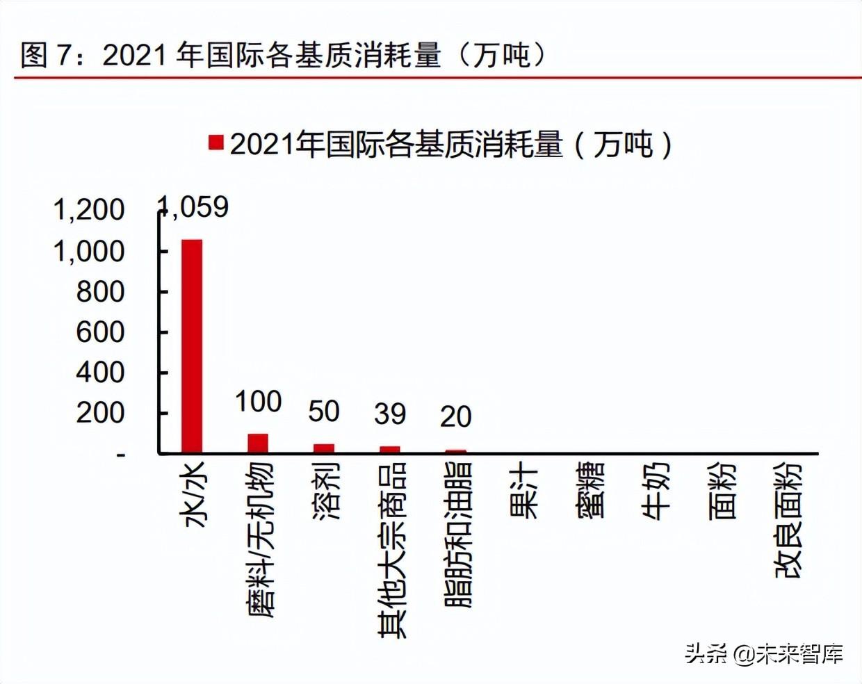 从国内外市场来看,微生物培养基和美白剂复合增速最明显,体现出微生物发酵技术 的较高热度和美白需求的旺盛。国际市场上,微生物培养基 2021年消耗量达到 6594.3吨, 2008-2021 年年复合增速达到 39.3%,2016-2021 年年复合增速达到 94.4%。美白剂消耗 量达到 3057 吨,2008-2021 年年复合增速达到 12%,2016-2021 年年复合增速达到 12%。 国内市场上,微生物培养基 2021 年消耗量达到 2868.1 吨,2008-2021 年年复合增速达到 51%,2016-2021 年年复合增速达到 123.6%。美白剂消耗量达到 1042.2 吨,2008-2021 年年复合增速达到 14.3%,2016-2021 年年复合增速达到 16.8%。