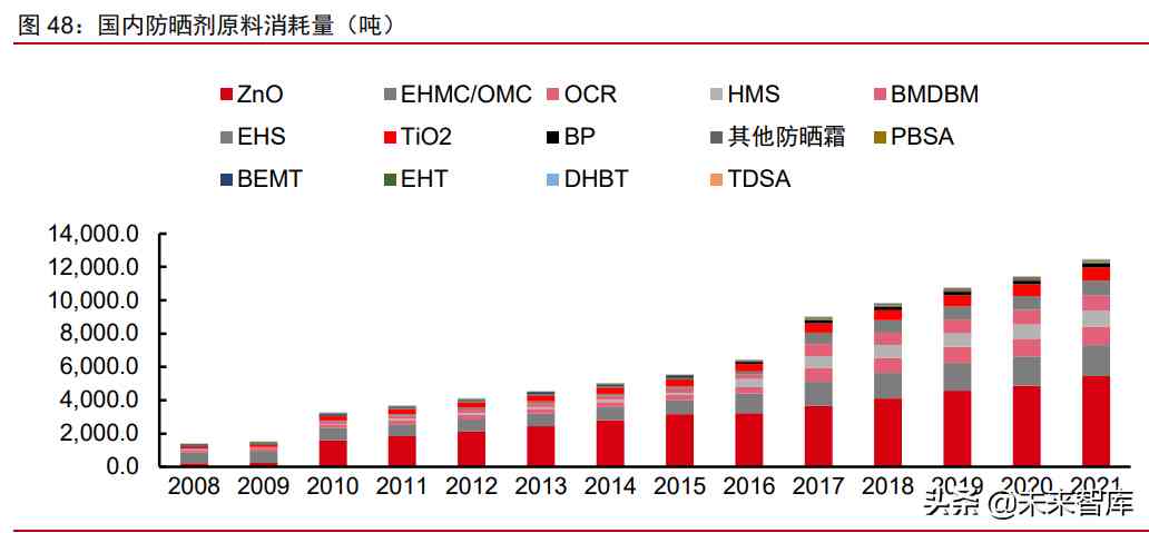 近 3 年来双乙基己氧基苯酚甲氧基苯基三嗪 BEMT、乙基己基三嗪酮/辛基三嗪酮/ EHT 和对苯二亚甲基二樟脑磺酸 TDSA 增速最高。2019-2021 年消耗量增速 TOP3 的防 晒剂原料分别是 BEMT、EHT 和 TDSA,增速分别达到了 10%、10%、10%。2016-2021 年增速 TOP3 的分别是其他防晒剂、水杨酸乙基己酯 EHS 和丁基甲氧基二苯甲酰甲烷 BMDBM,增速分别达到 57.4%、35.4%和 29.9%。2008-2021 年增速 TOP3 分别是胡莫 柳酯 HMS、EHS 和氧化锌 ZnO,增速分别达到 49.5%、30.1%、27.5%。