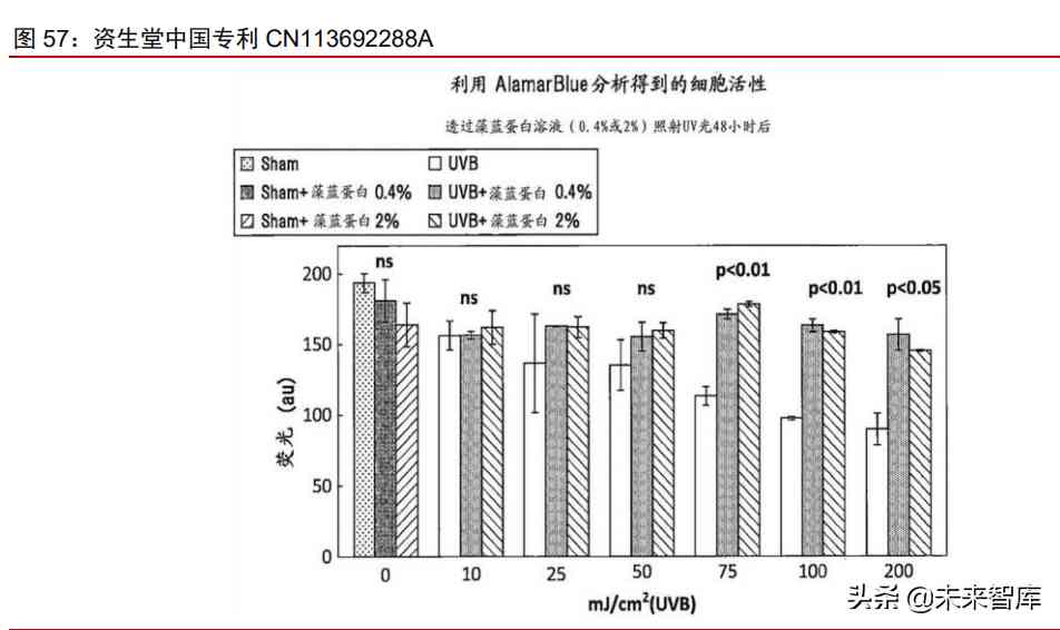 2022 年资生堂推出“美容光技术”专利,添加“勃那特螺旋藻提取物(藻蓝蛋白)+ 荧光氧化锌”,应用光致发光原理,将部分紫外线转化成对人体有益的光。其中,勃那特 螺旋藻提取物转化出的可见光波长较长,可以激活真皮层细胞,进而促进胶原蛋白和透明 质酸的生成,发挥抗老效果。荧光氧化锌转化出的可见光波长较短,主要激活皮肤表皮层 的细胞,抑制紫外线对表皮细胞活性的影响。若使用 2%的藻蓝蛋白,则 UVB 对细胞活性 的抑制现象将被完全抵消,且细胞活性甚至比没照射 UVB 时还强。该技术已在日本和中 国申请专利通过,具体应用在安耐晒防晒精华粉色装和资生堂防晒乳液 urban triple beauty suncare emulsion。