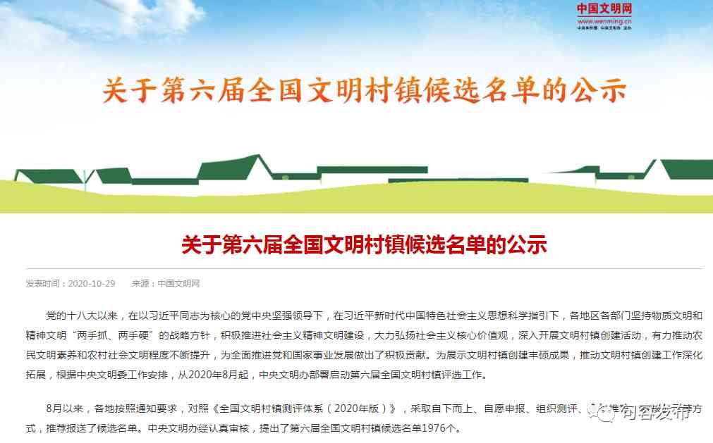 《关于第六届全国文明村镇候选名单的公示》