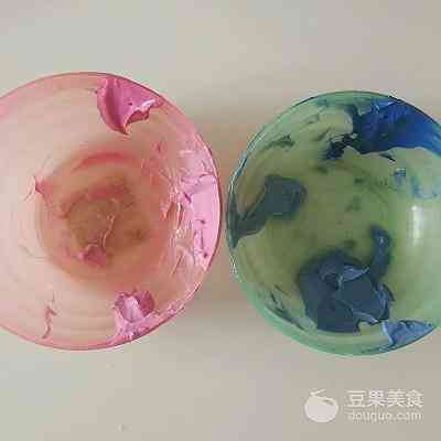 5、调出少量的粉色和蓝色, 粉色调出深粉和浅粉, 蓝色调出深蓝、蓝、浅蓝, 照片上看起来不明显,尽量调的色差大一些,这样画出来才能表现出深浅、明暗。 用量很少,照片上碗里这些都用不完,粉色勾勒荷花瓣,蓝色填充小鸟背部。