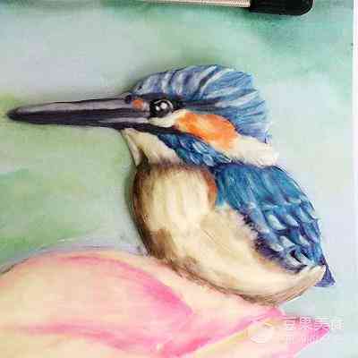 2、用白色奶油霜,填充小鸟的肚子部位。根据小鸟的形态,用勾线笔描出立体轮廓。 这幅图的小鸟肚子部分和初荷的花苞都是白色为主,所以我没有用调色的奶油霜进行填充,而是直接用白色奶油霜填充打底,之后再用颜色在表面描绘。
