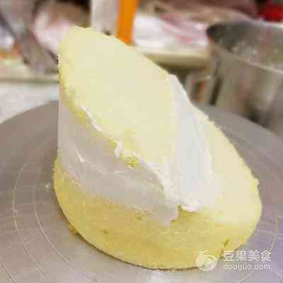 12、把切下来的小块叠摞在大块的上面,用淡奶油夹层固定,如图所示。 此步夹层可以夹一些水果、果酱之类丰富口感。