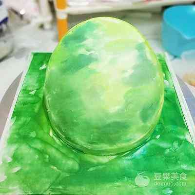 14、用深浅不同的绿色随意抹出抽象的纹路,呈现荷塘影影绰绰的意境。 蛋糕底托也一样涂抹,底托的颜色里我添加了一些蓝色,表达池水的蓝与荷叶的绿交相辉映。