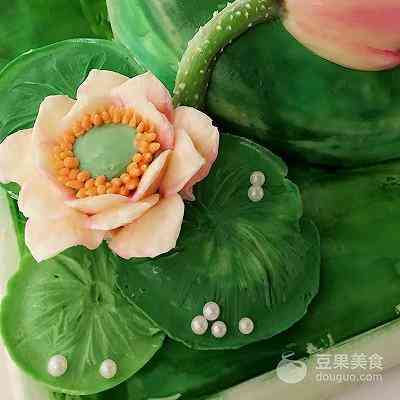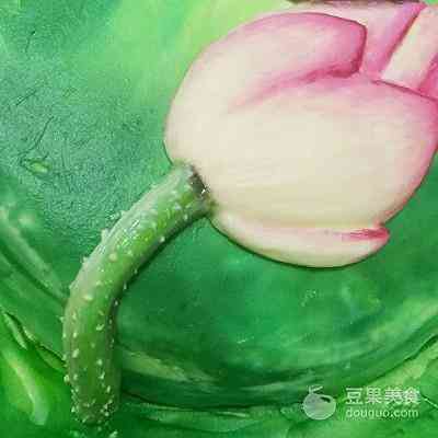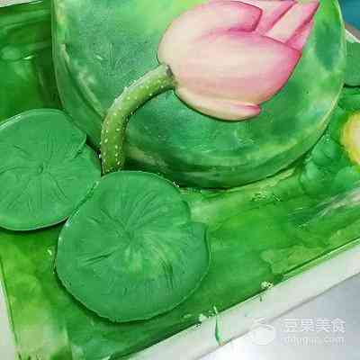 20、用荷花专用裱花嘴,裱出荷花,搭配荷叶摆放在合适位置。