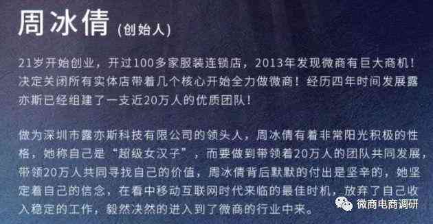 据多方资料介绍,此人于18岁孤身闯荡深圳,21岁独立创业。目前,周冰倩已经有了露亦斯公司创始人、董事长的身份,正全面负责公司战略规划、定位和管理工作。至今,拥有10多年的创业经验,8年的微商实战经验的她已揽获到了“ 亚洲销售女神”、“微商教母级人物”等美誉。