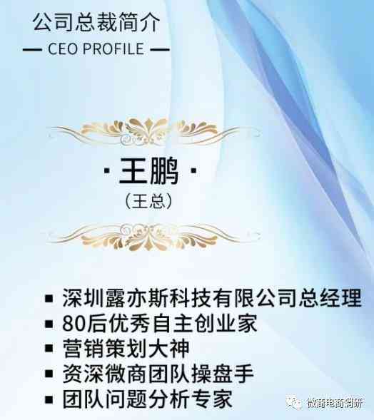 目前担任露亦斯公司CEO则是一个名叫王鹏的人,此人负责管理公司日常运营以及对外商务合作工作 ,是资深微商团队操盘手,也是团队问题分析专家。