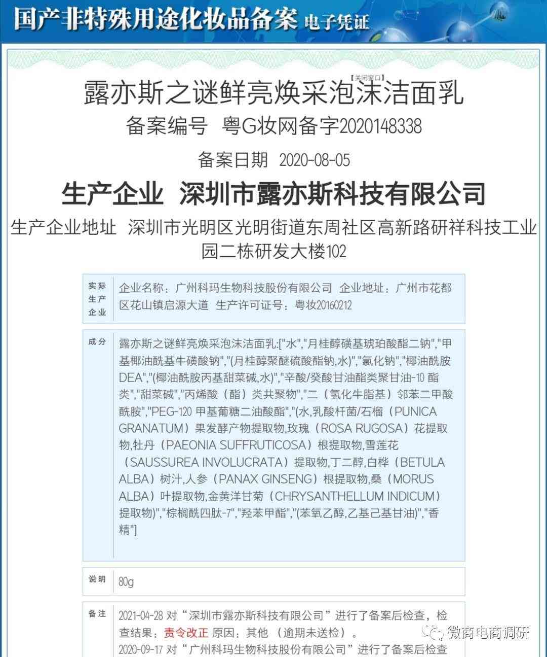经查国产非特殊用途化妆品备案服务平台,我们发现露亦斯公司备案了多款化妆品。但半数化妆品均已注销,其中,有不少化妆品都遭到过有关部门一次或二次的责令改正。调查发现,露亦斯之谜鲜亮焕采泡沫洁面乳(粤G妆网备字2020148338)、Louis secret小分子燕窝精粹原液(粤G妆网备字2020097154)、露亦斯之谜鱼子酱营养柔顺发膜(粤G妆网备字2019303772)、露亦斯之谜鱼子酱净爽丝顺洗发乳(粤G妆网备字2019294972)、露亦斯之谜VC焕颜美肌面膜(粤G妆网备字2019294973)曾遭到一次责令改正,原因均为:逾期未送检。
