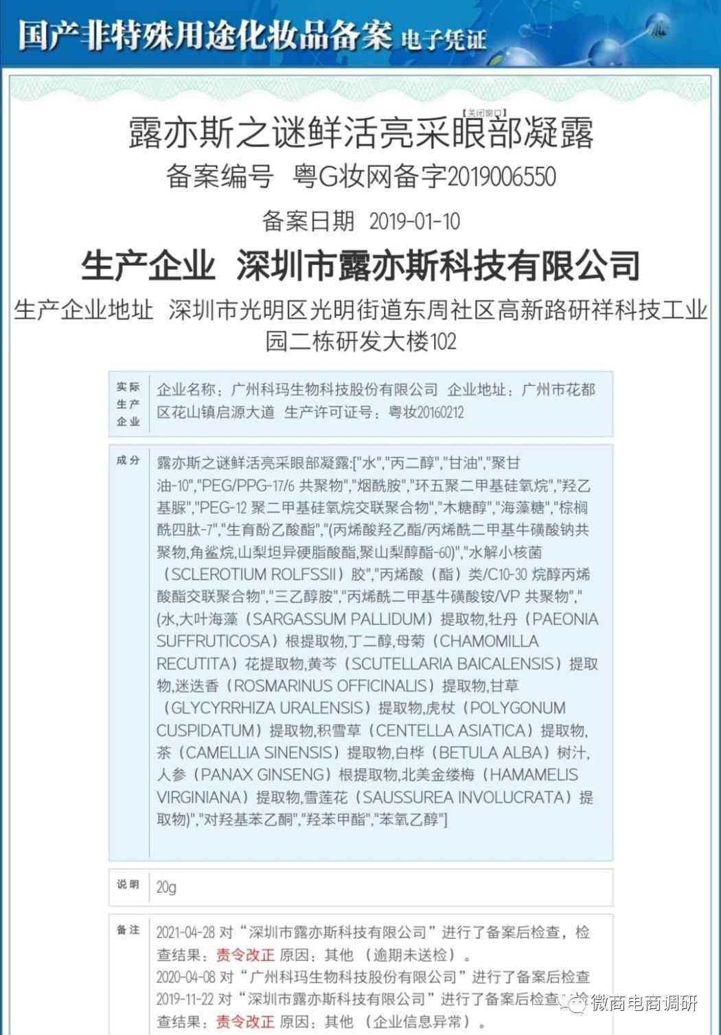 而露亦斯之谜鲜活亮采精华乳(粤G妆网备字2019006549)、露亦斯之谜鲜活亮采眼部凝露(粤G妆网备字2019006550)、露亦斯之谜鲜活亮采植萃水(粤G妆网备字2019013693)遭到过两次责令改正,原因分别为:逾期未送检、企业信息异常。