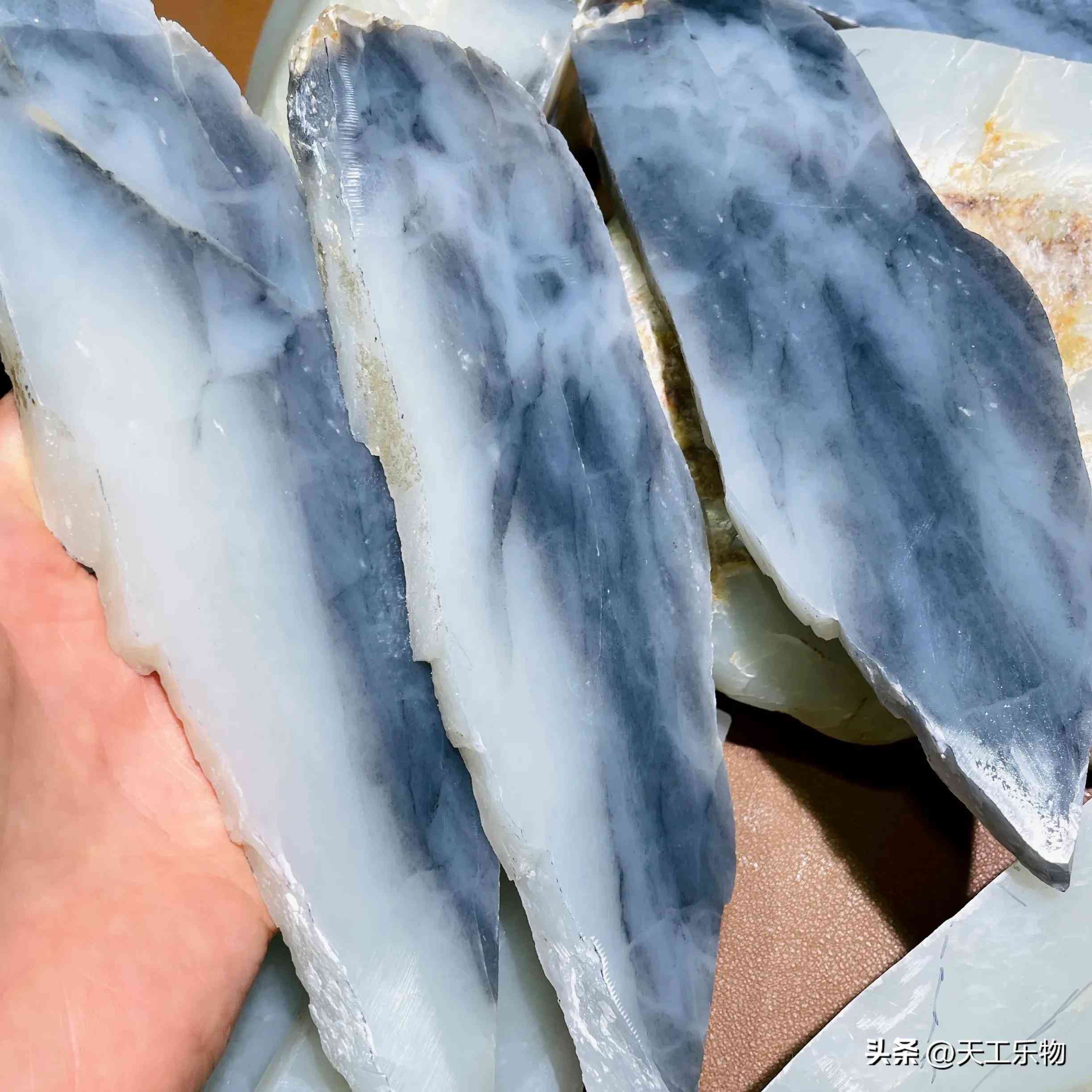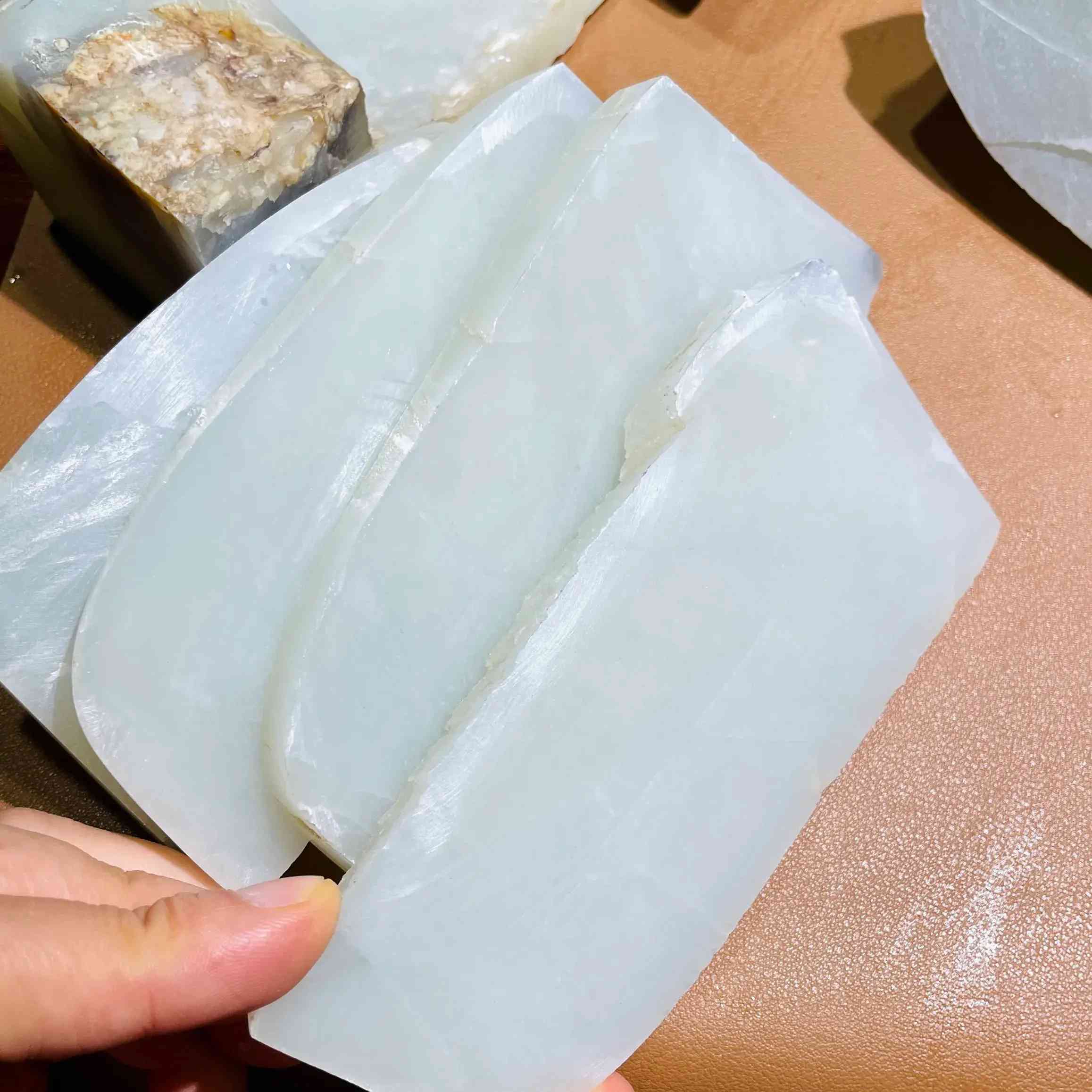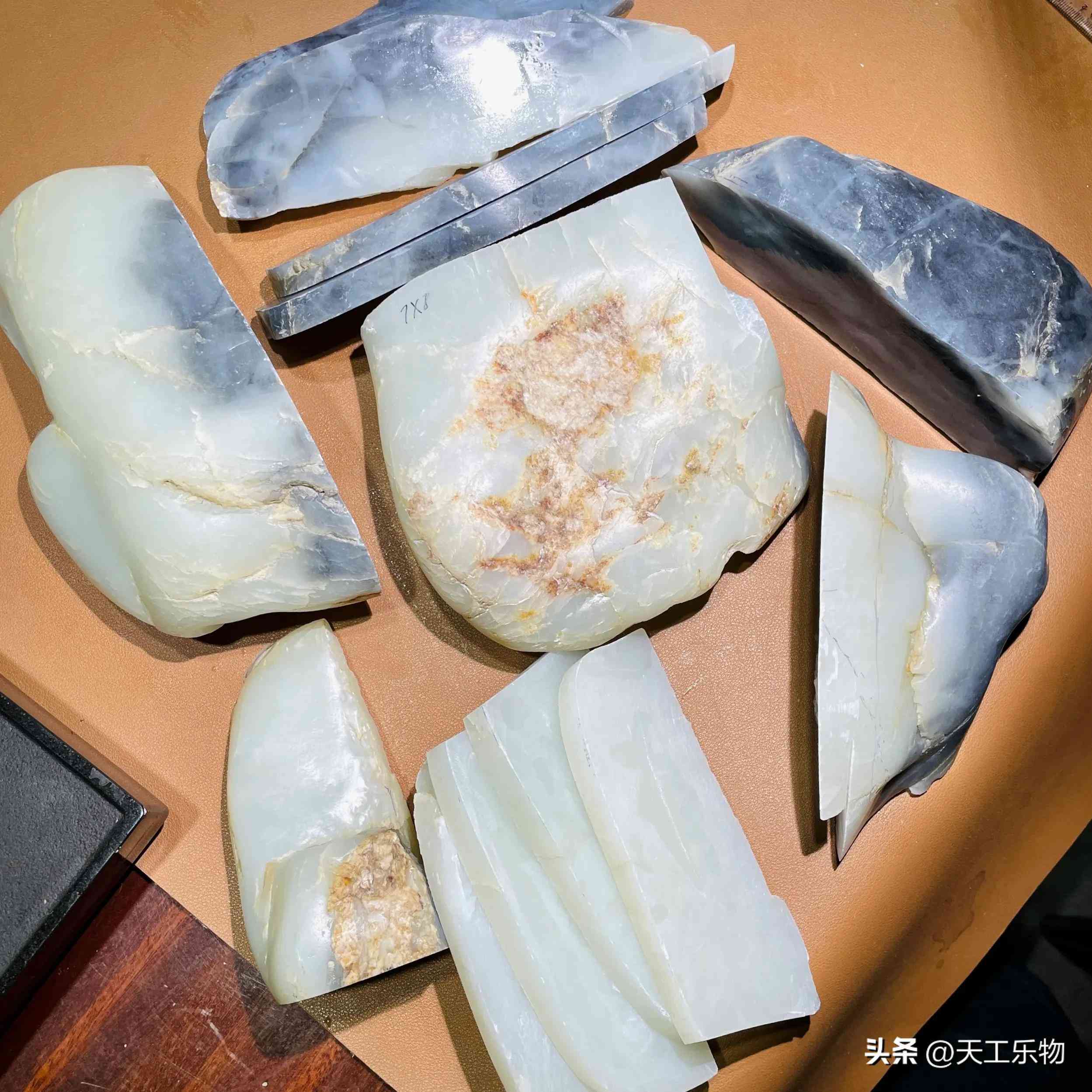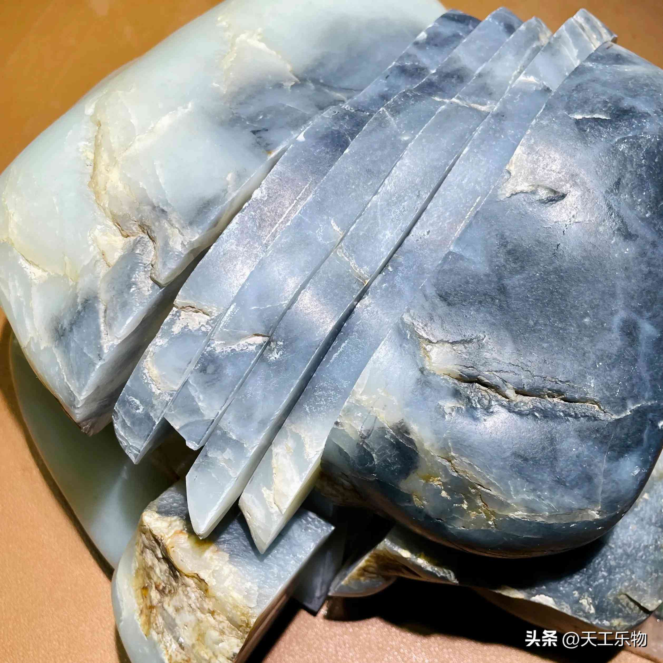 从已经切开的片料中,我们也能看到还是有绺裂藏在玉石之中,而且深度也比较明显。